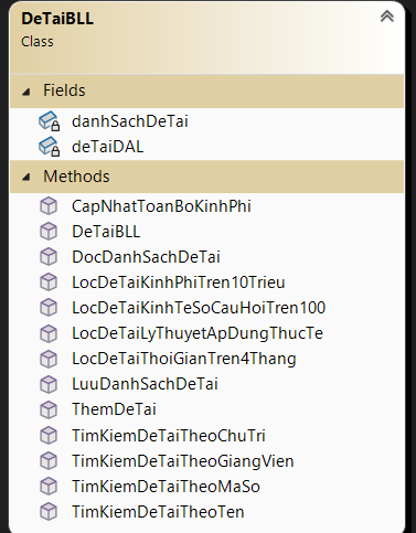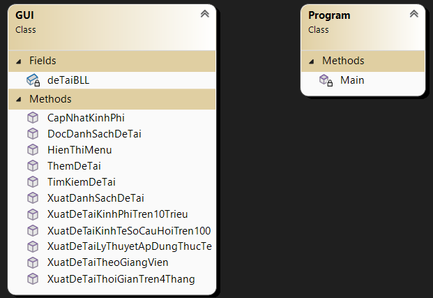 - Nghiên cứu lý thuyết: có thêm thuộc tính áp dụng thực tế (true/false); kinh phí thực hiện cho đề tài nghiên cứu lý thuyết có thể áp dụng thực tế là 15 (triệu đồng); nếu không áp dụng thực tế sẽ có kinh phí là 8 (triệu đồng).